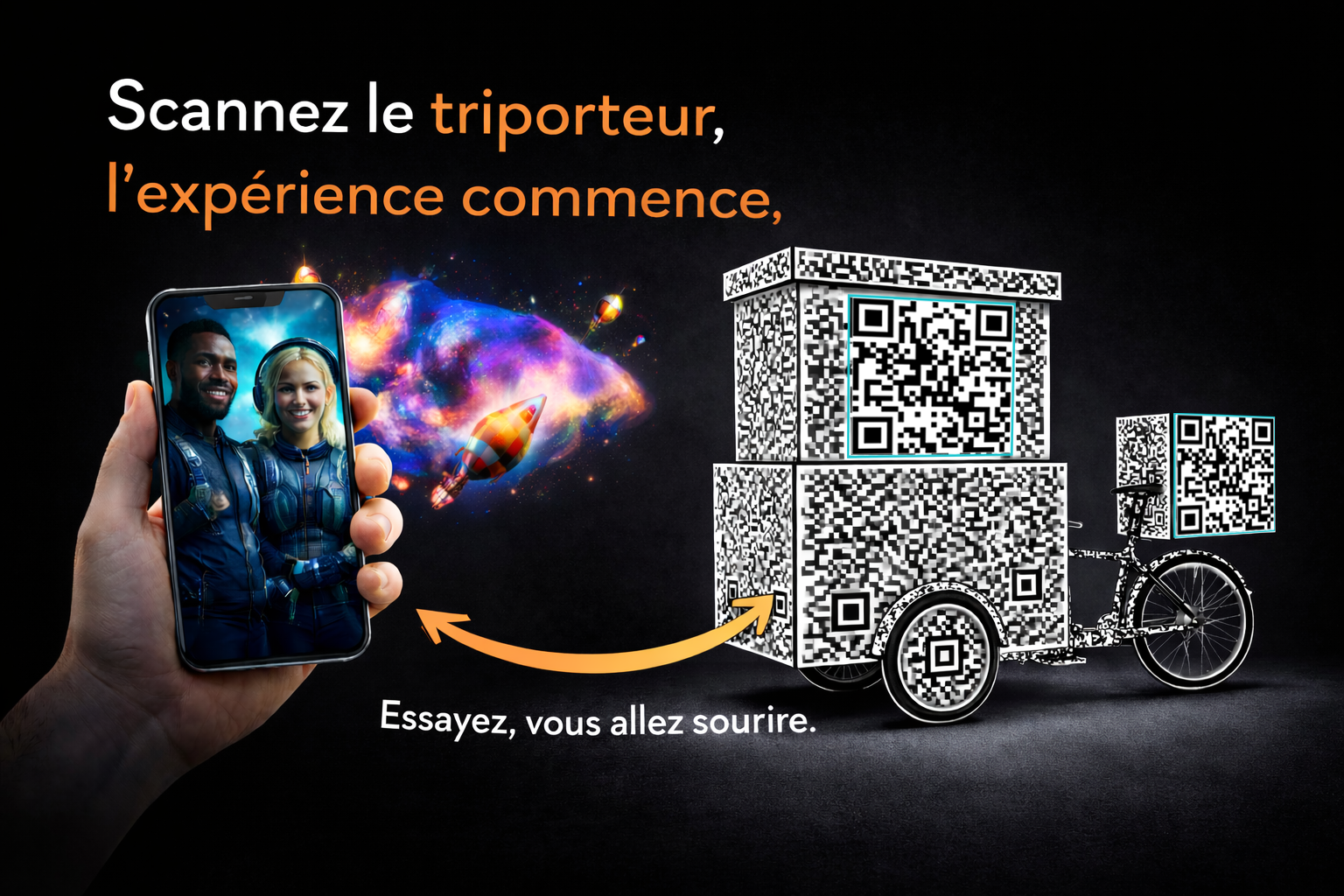 Une expérience mobile complète, à partir d’un QR code imprimé, du scan au partage, avec affichage sur écran en option.